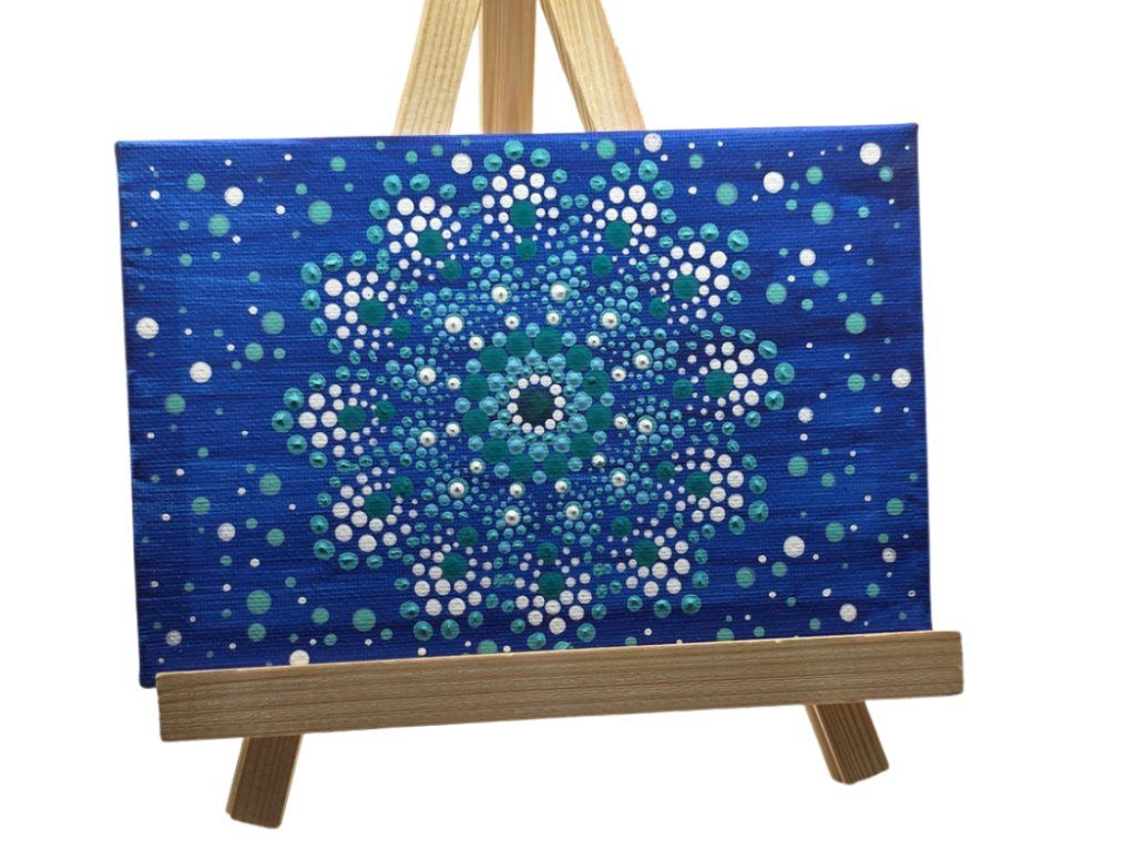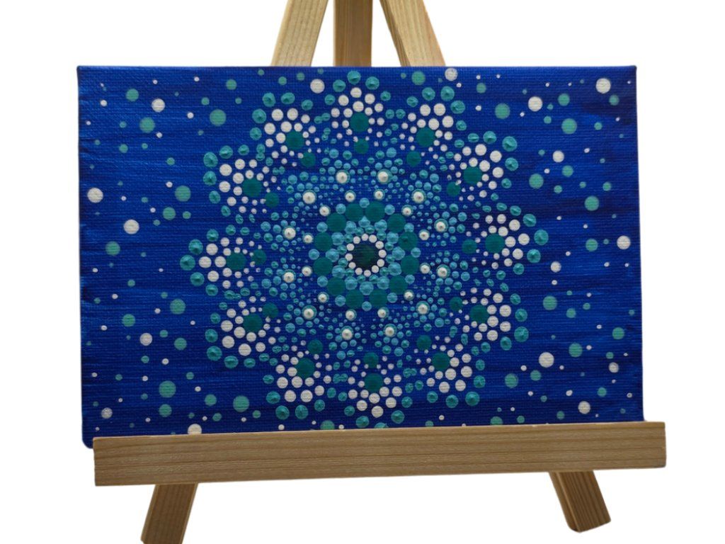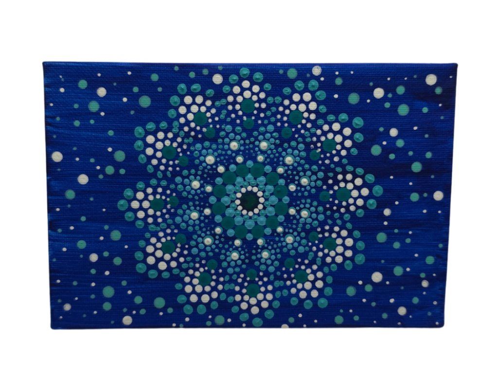 Tato mandala není tiskem, ale poctivou ruční prací vytvořenou technikou tečkování (dot painting). Každý bod byl nanášen s trpělivostí a záměrem vytvořit harmonický celek, který upoutá pozornost a zároveň zklidní mysl. Díky sytým odstínům modré barvy připomíná hlubinu oceánu nebo jasnou noční oblohu, což napomáhá relaxaci a soustředění.